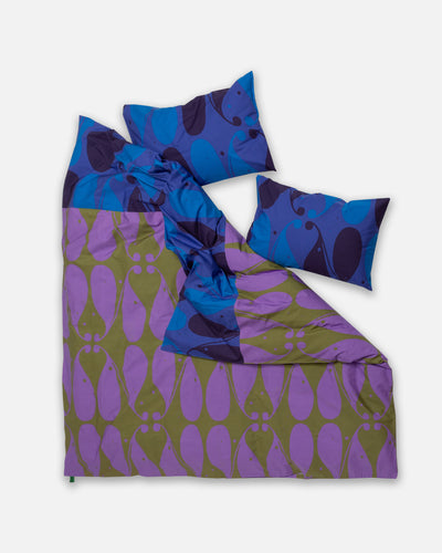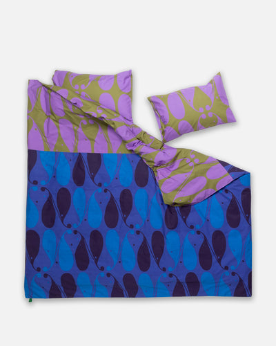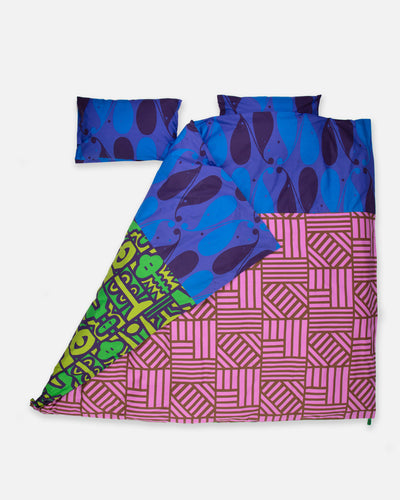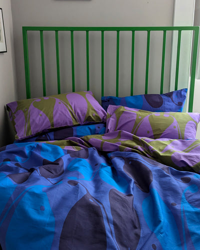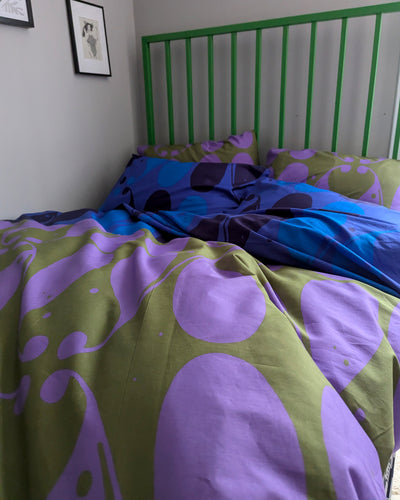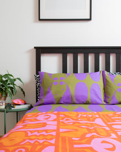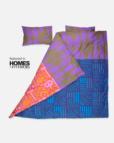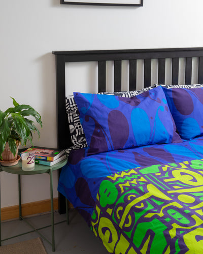 Our bold + vibrant art inspired reversible duvet sets are made in the same GOTS certified organic cotton & joyous print designs as our pyjamas, and constructed in our signature 3 piece construction which features 2 contrasting patterns on each side, creating joyous art for your bed with a choice of colourful 'moods'.