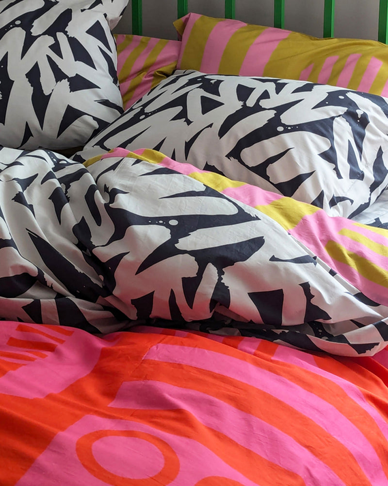 Our bold + vibrant art inspired reversible duvet sets are made in the same GOTS certified organic cotton & joyous print designs as our pyjamas, and constructed in our signature 3 piece construction which features 2 contrasting patterns on each side, creating joyous art for your bed with a choice of colourful 'moods'.
