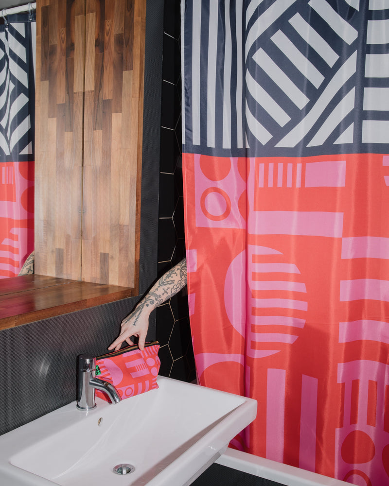 Guaranteed to elevate your bathroom game, our maximalist shower curtains feature our signature oversized graphics and the split pattern design that you will know from our bedding + reversible throws.