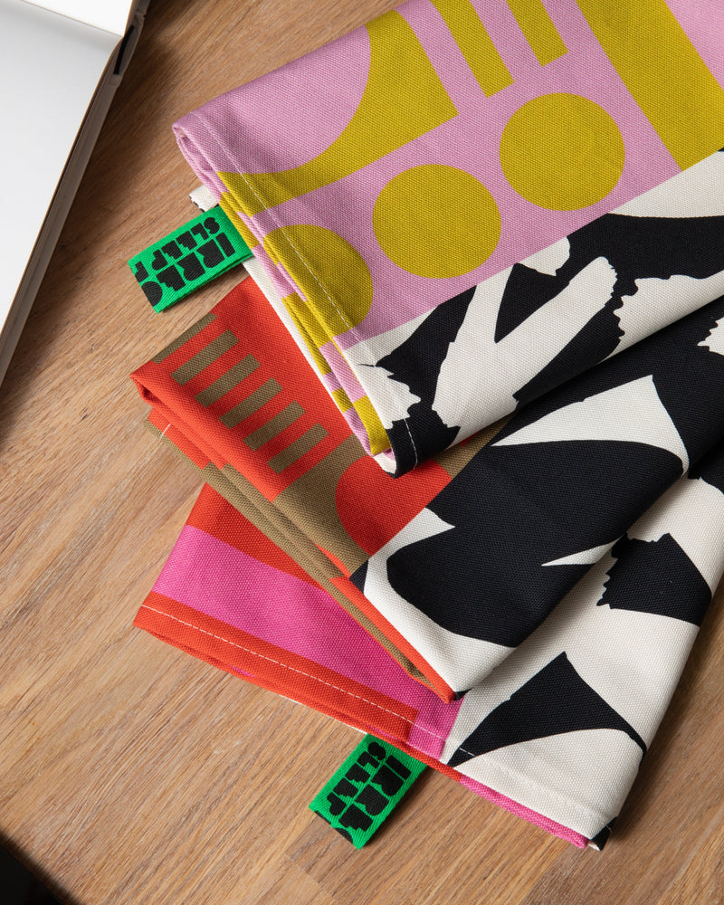Our bold + colourful patterned organic cotton tea towels are here to transform domestic drudgery into a joyous celebration of the absorbent properties of fabric. These geometric beauties are made in the UK and featuring a 'split' motif echoing the distinctive look of our irregular bedding sets